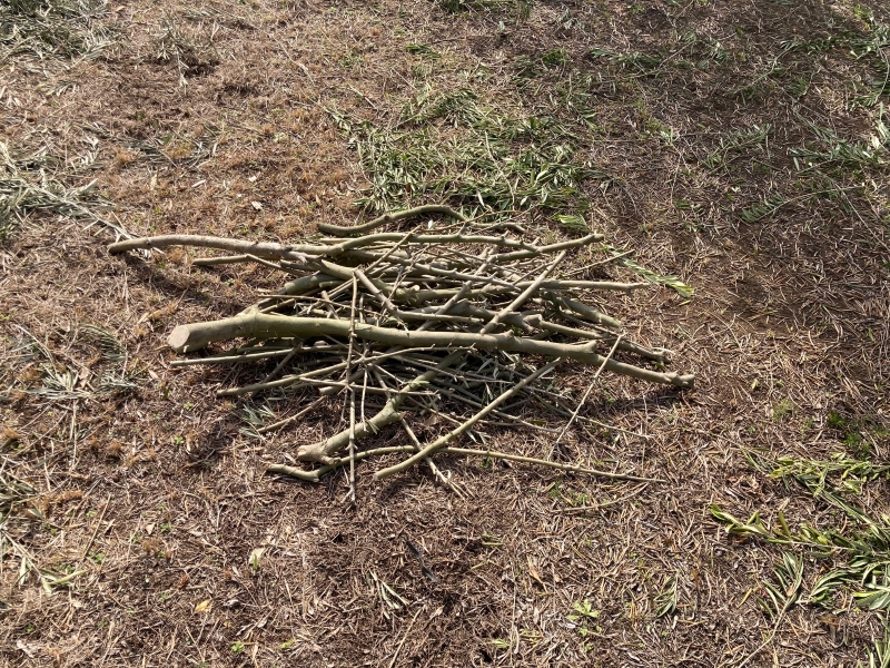 切った太枝から細かい枝を切り落とし
