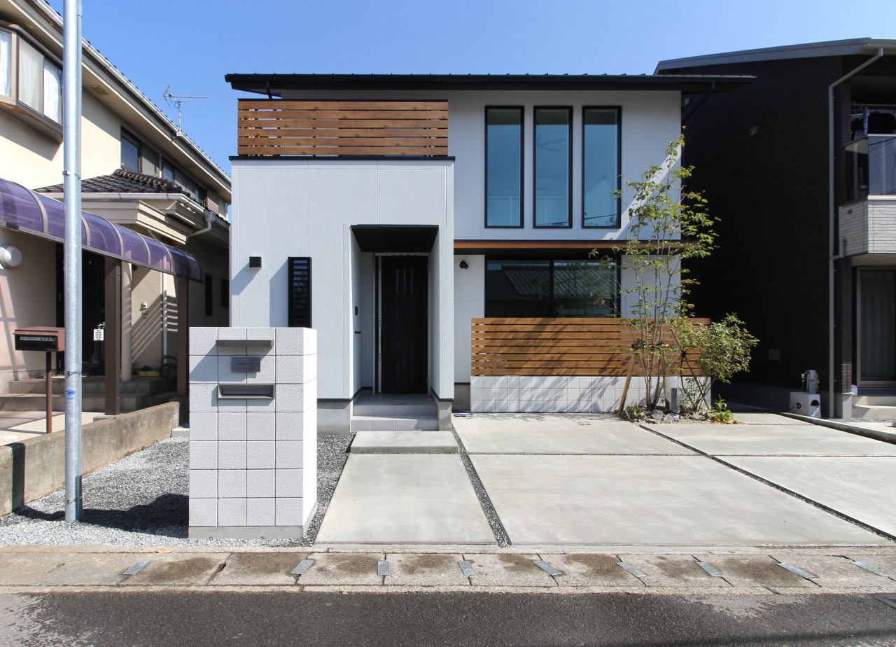白い外壁に黒いサッシ。アクセントに木目調手摺。