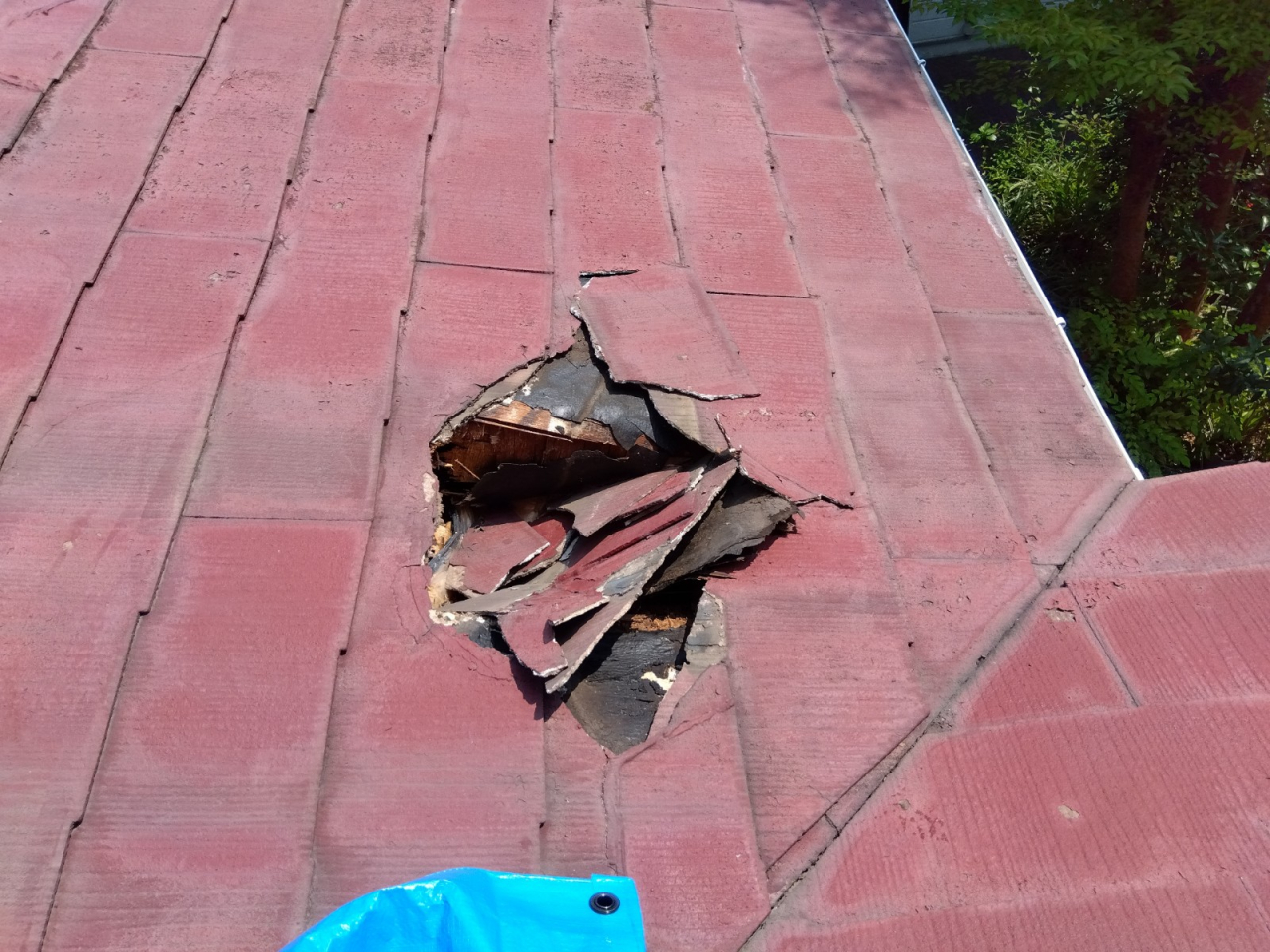 別の業者さんが屋根に乗った際に穴を開けてしまったとのことで、屋根を見に行くと下地ごと無くなっていました。