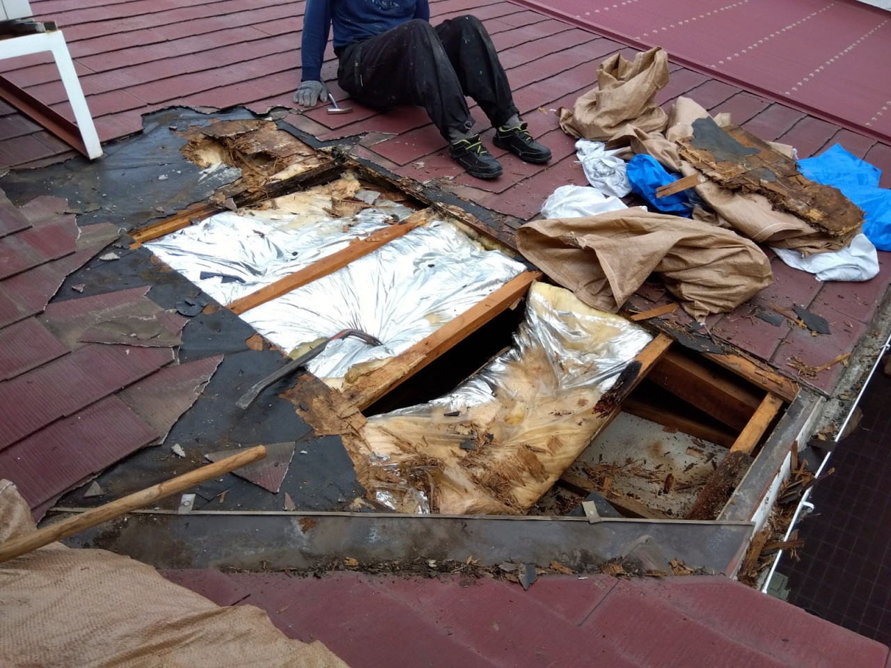今回の工事では、腐ってしまった部分を撤去して新しい下地をつくり、その上から金属の屋根を被せるカバー工法で補修します。