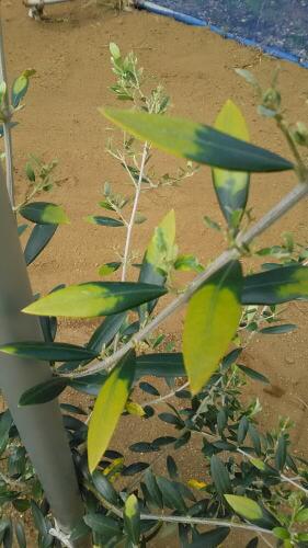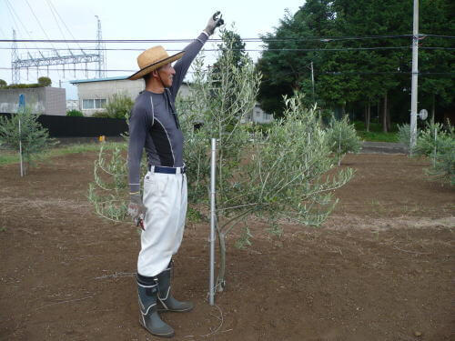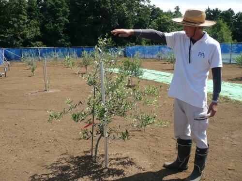 写真左は圃場Aで一番背が高く成長しているオリーブ(品種:コラティーナ)高さ約2m