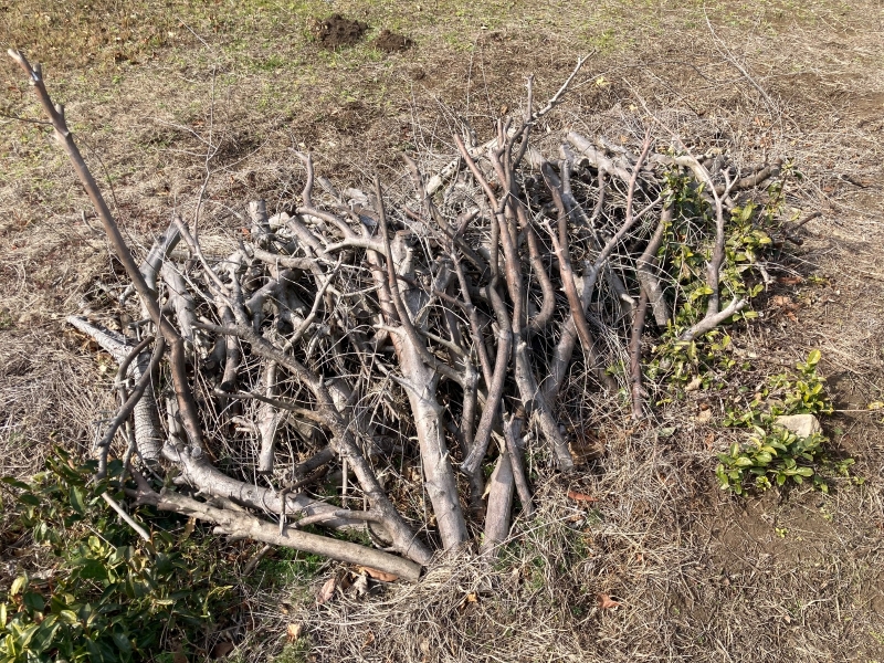 切った太枝から細かい枝を切り落とし
